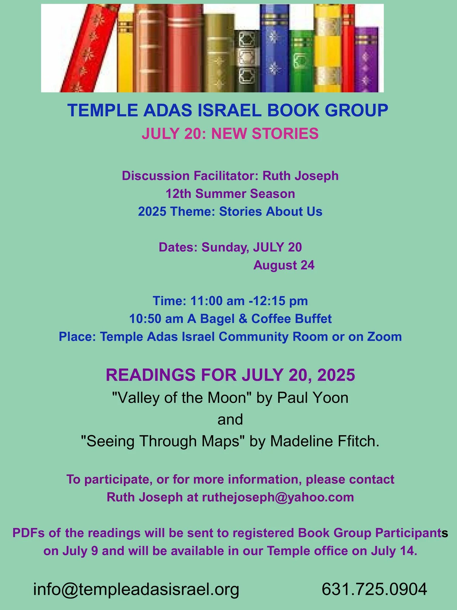 To participate or for more information, email Ruth Joseph. PDFs of the readings will be sent to registered participants on June 10 and will be available in our Temple office on June 14.