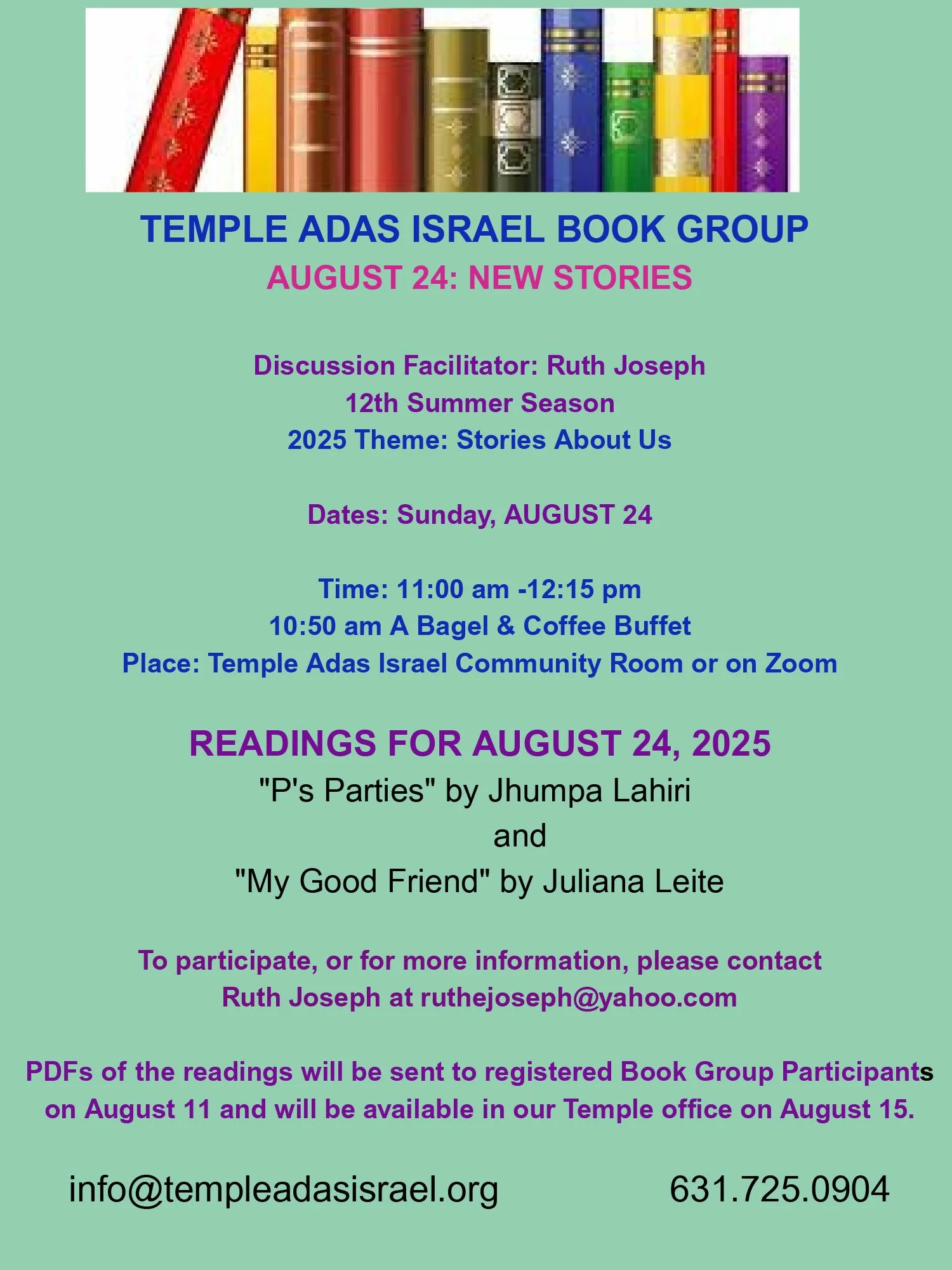 To participate or for more information, email Ruth Joseph. PDFs of the readings will be sent to registered participants on June 10 and will be available in our Temple office on June 14.